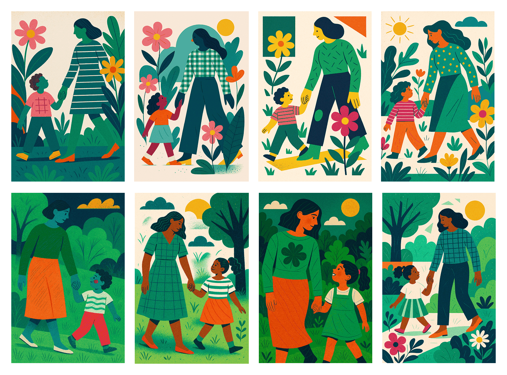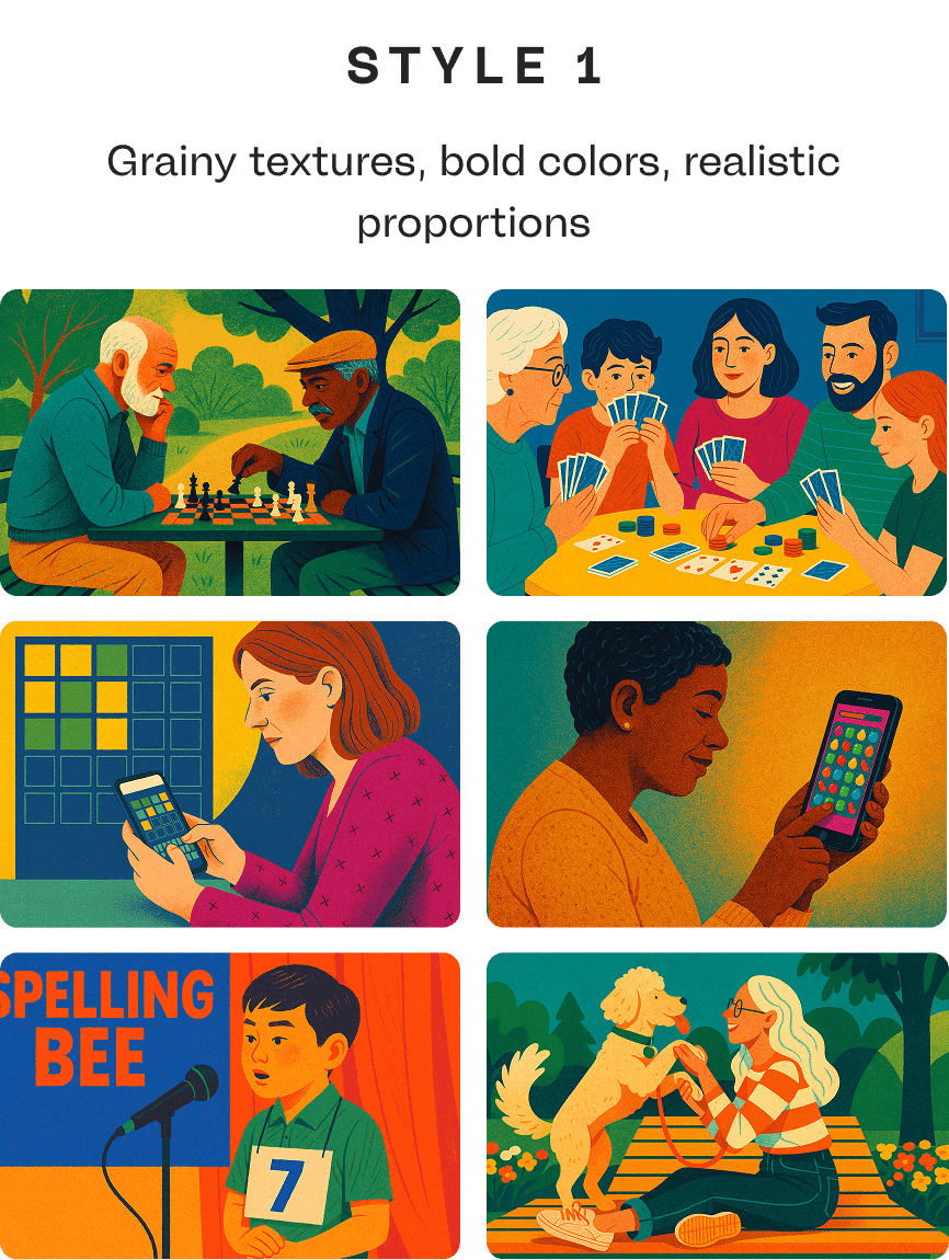 From there, I took a more flexible approach to exploring what was possible. I knew I wanted bold colors and some texture or fluidity to humanize the illustrations. I started with with a simple set of instructions within a ChatGPT project and iterated from there.