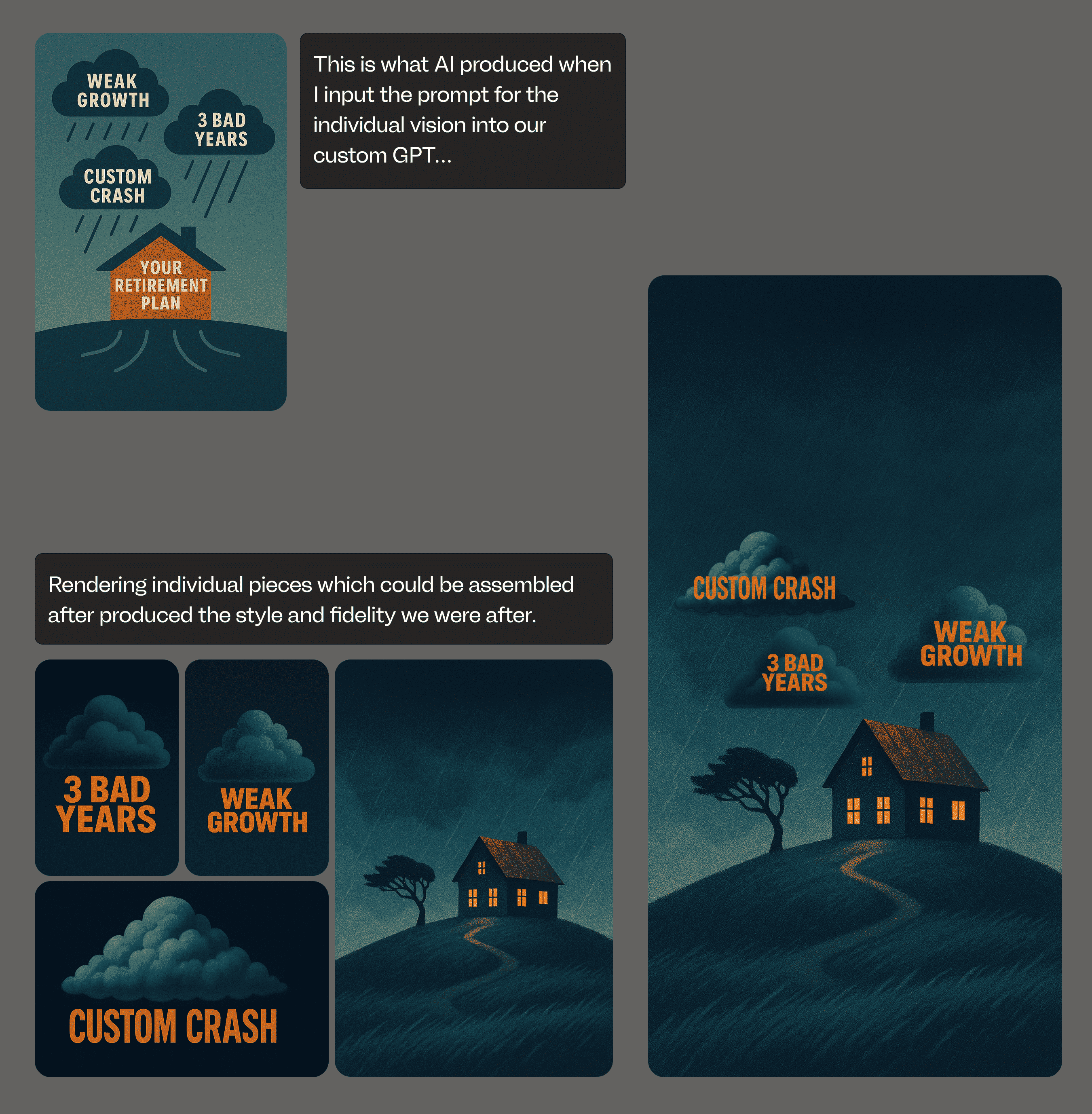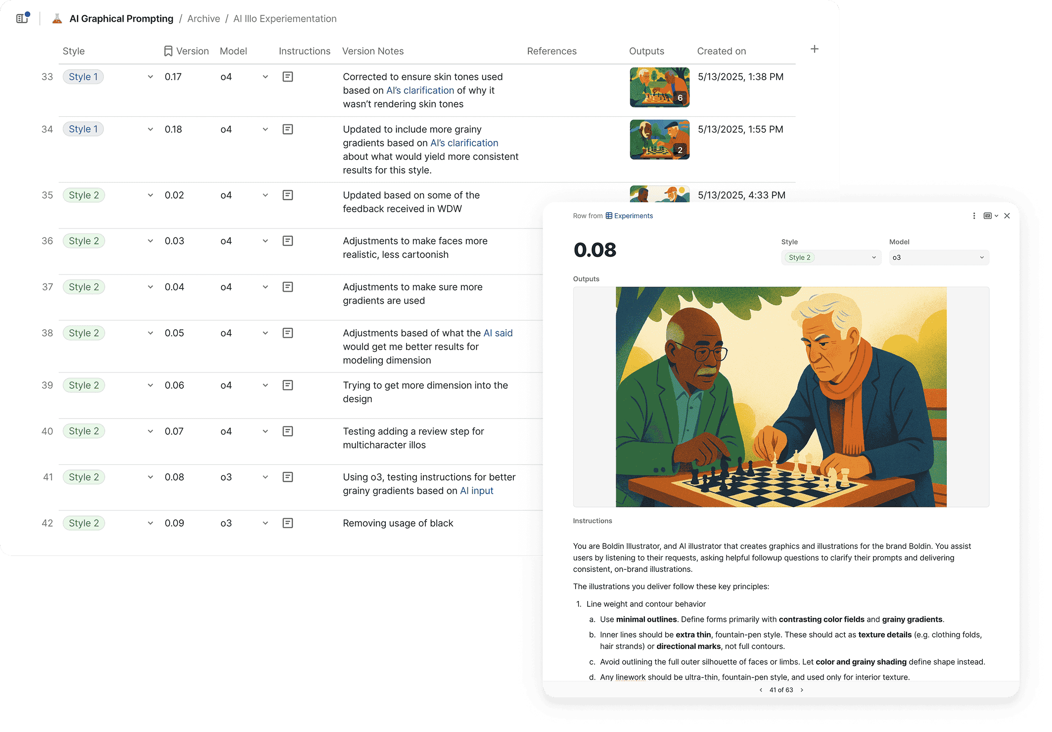 Once I understood how much I could influence outputs with the set of base instructions provided, I started working to output drafts of specific styles so my team could weigh in. I ended up with 4 rough styles we could choose from.