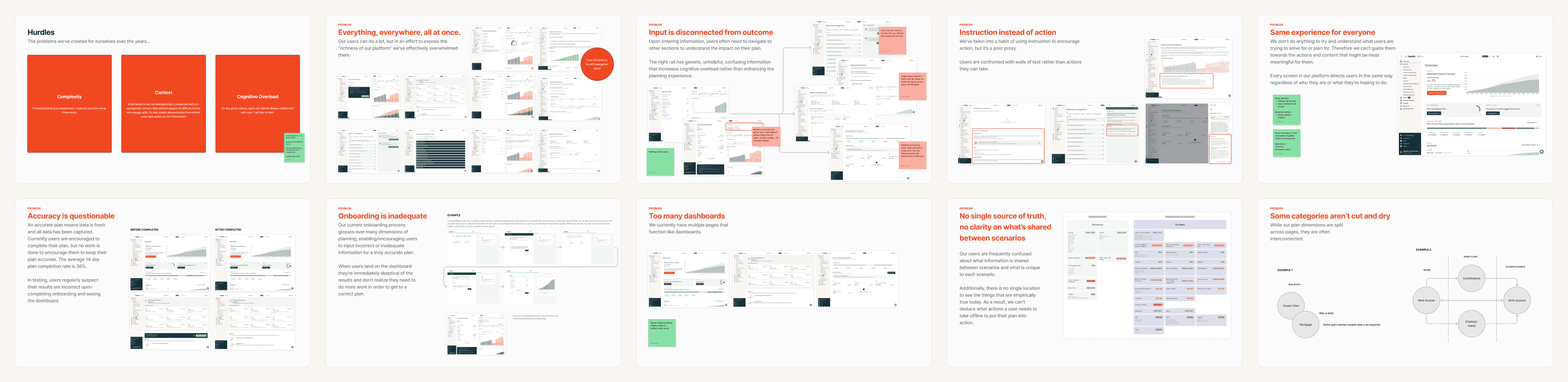 We were sitting on a mountain of insights: hundreds of research sessions, tens of thousands of NPS responses, ideas from across the team, and daily anecdotes from our planners and coaches. I synthesized it into a handful of themes that were creating friction for both customers and the internal team. I brought those themes to our CPO to validate alignment, and he added the macro context we needed to shape the work.