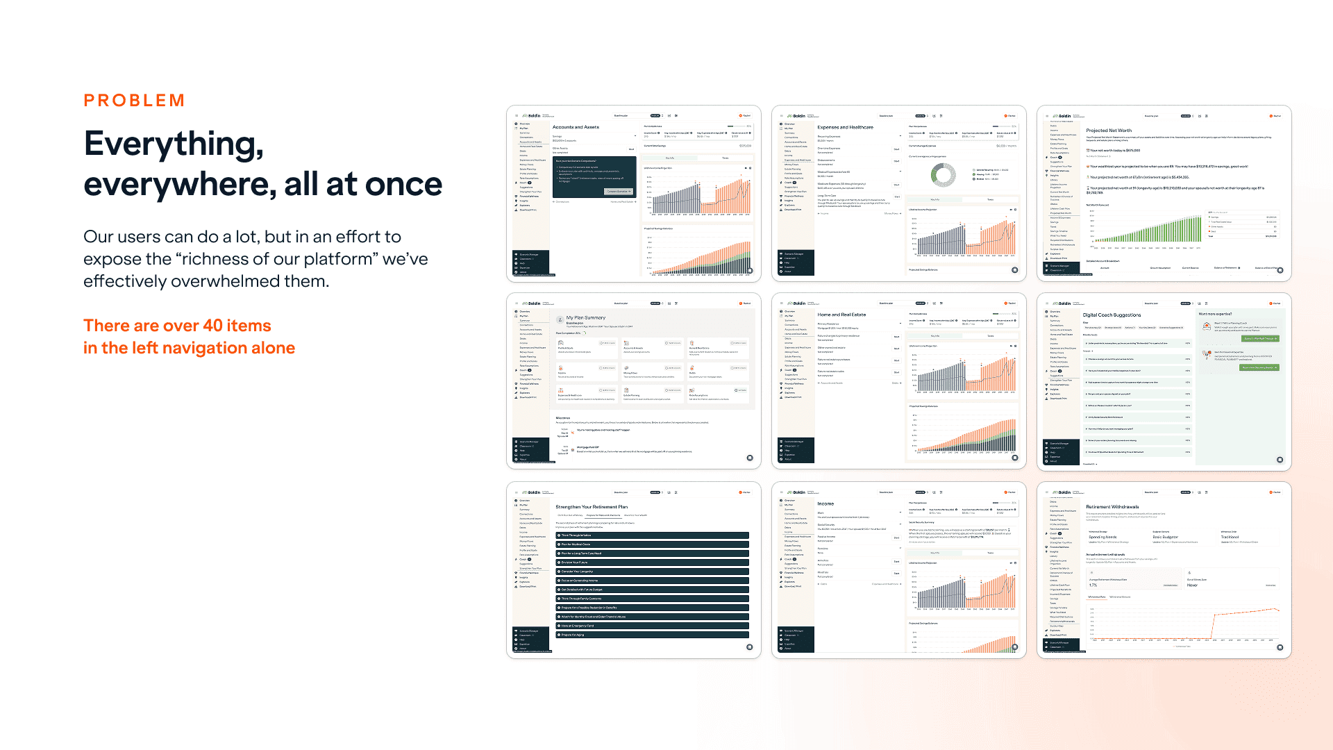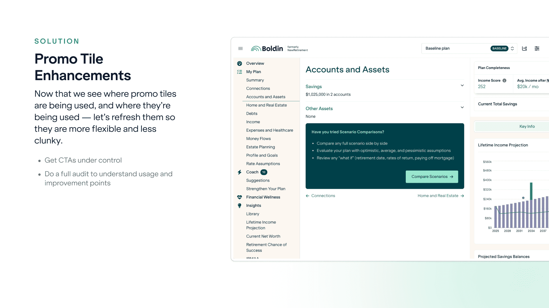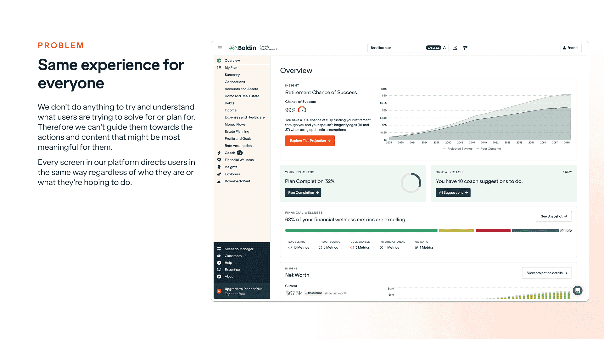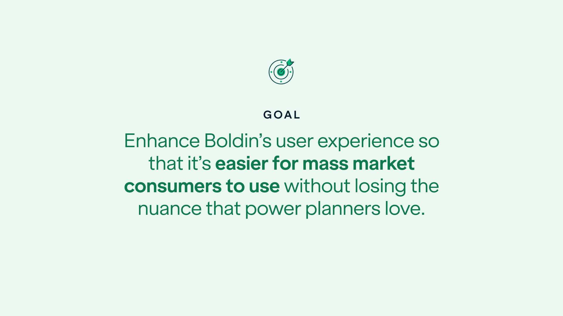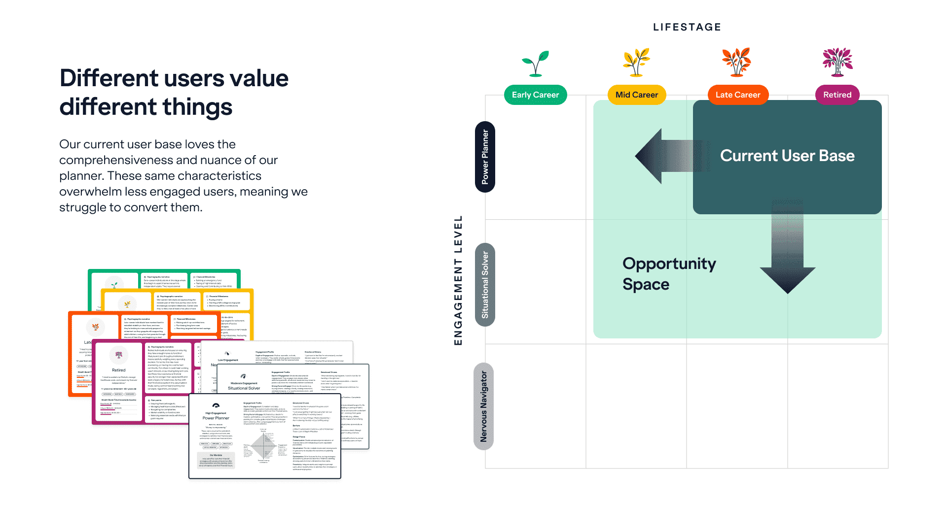 In early 2025, everything shifted: a new Chief Product Officer, a new brand, new personas, and a new OKR—move to the mainstream. Historically, we’d built for Power Planners: people who love spreadsheets and genuinely enjoy nerding out on retirement planning. But to grow, we needed to resonate with a broader audience—people who want clarity and confidence, not a new hobby. The brand helped signal that shift, but the product experience still spoke Power Planners.