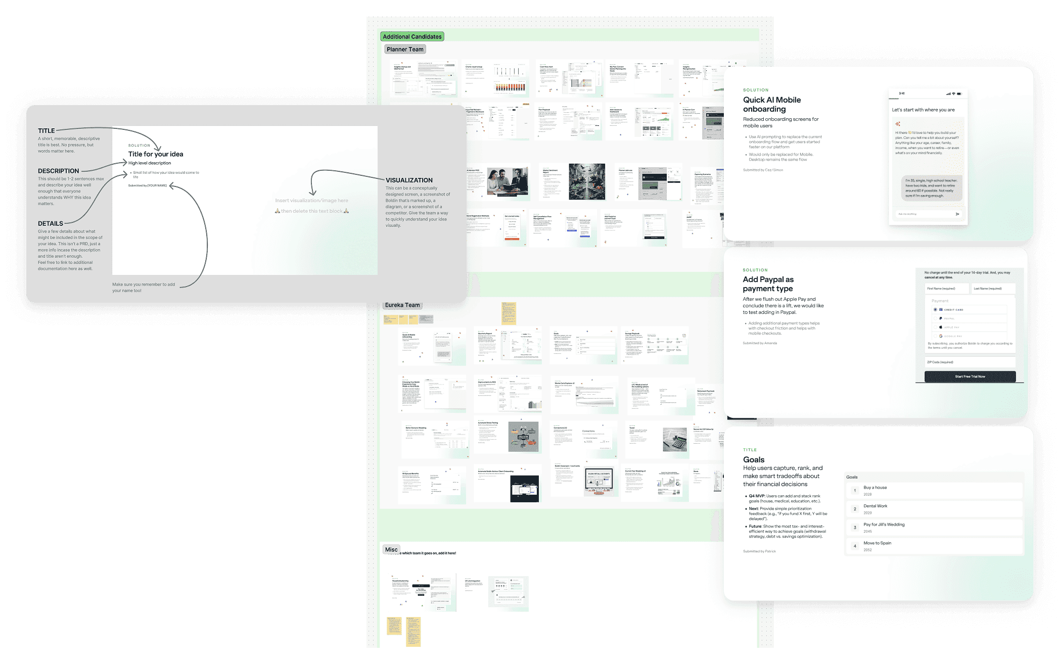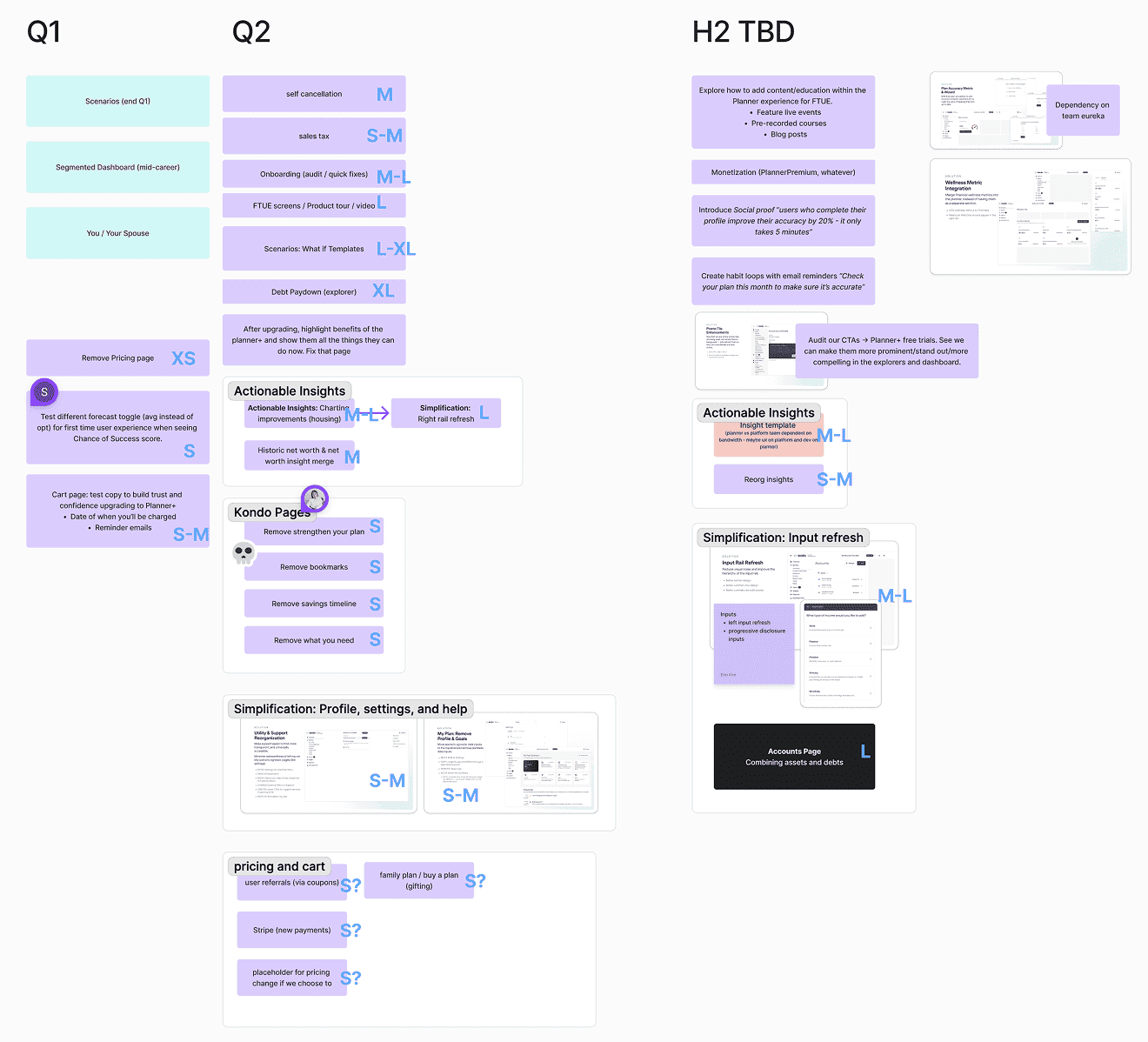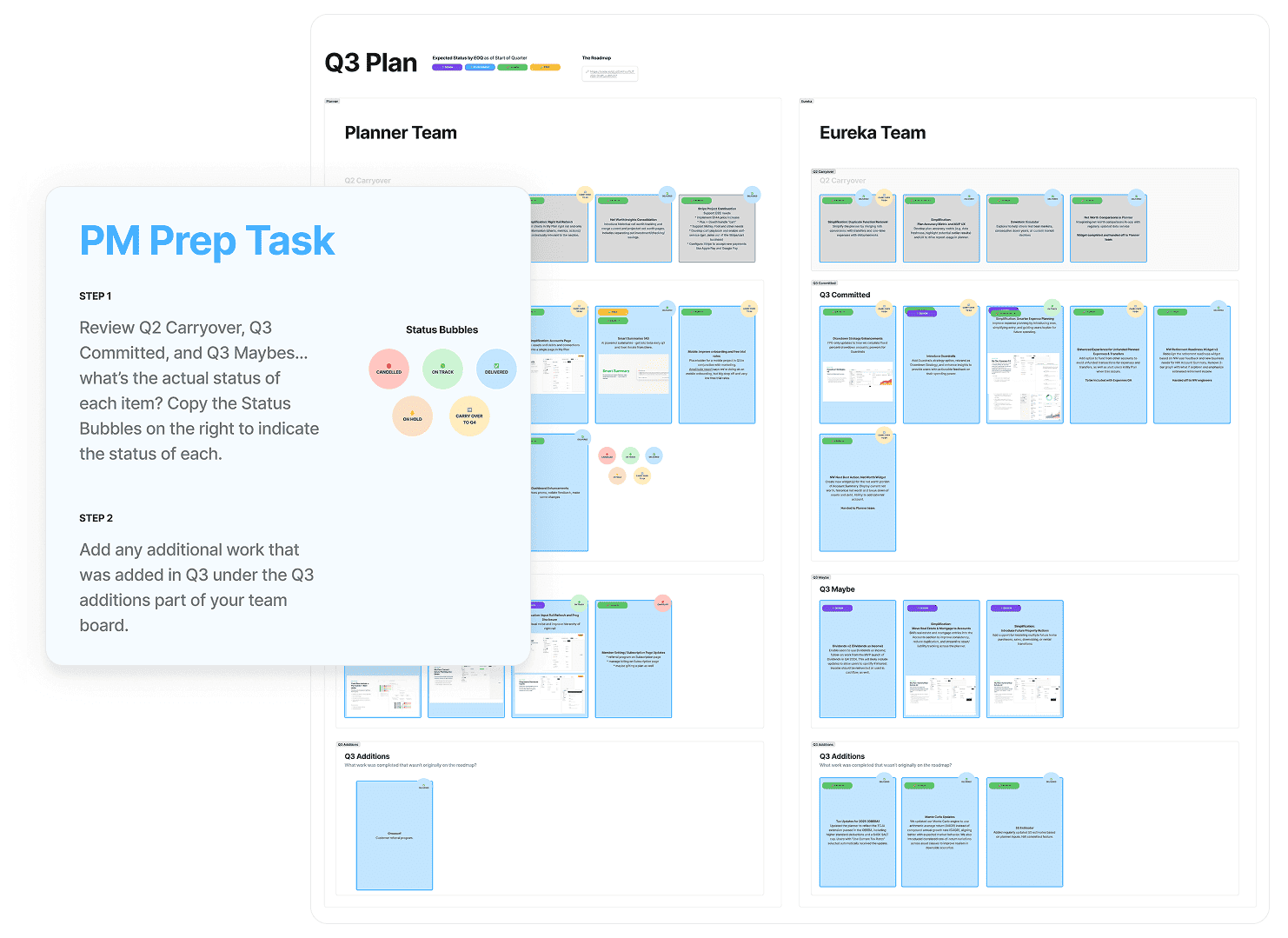 Q2 planning was great, and we wanted to take what we learned and evolve it for Q3. The big shift for Q3 was that every roadmap candidate needed to have a visual and small description attached. Q3 kept planning to 1 PM, 1 designer, 1 engineering manager per team. The cards allowed everyone to easily imagine what team members were proposing and discuss the merits of each idea with a little more nuance.
