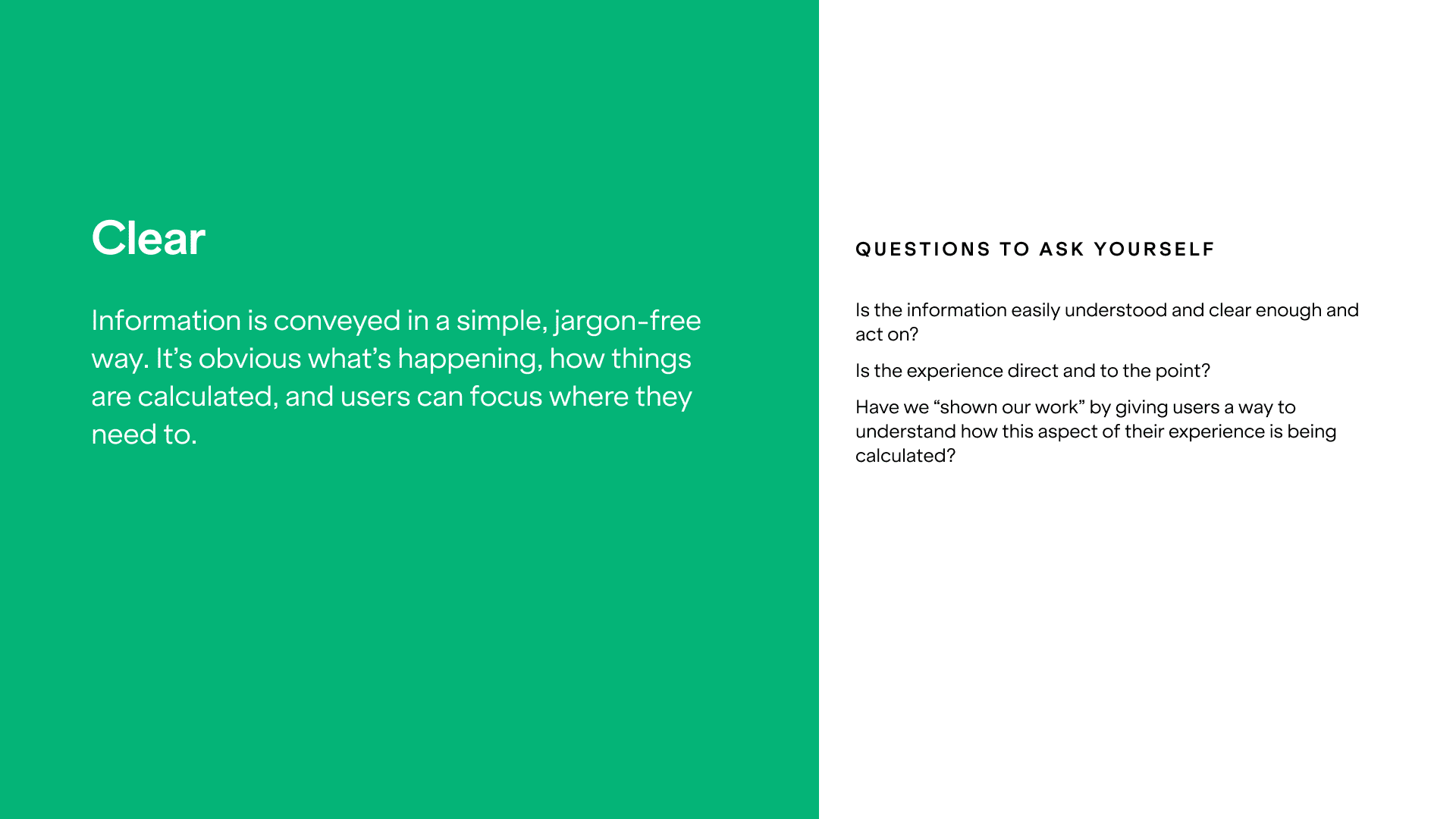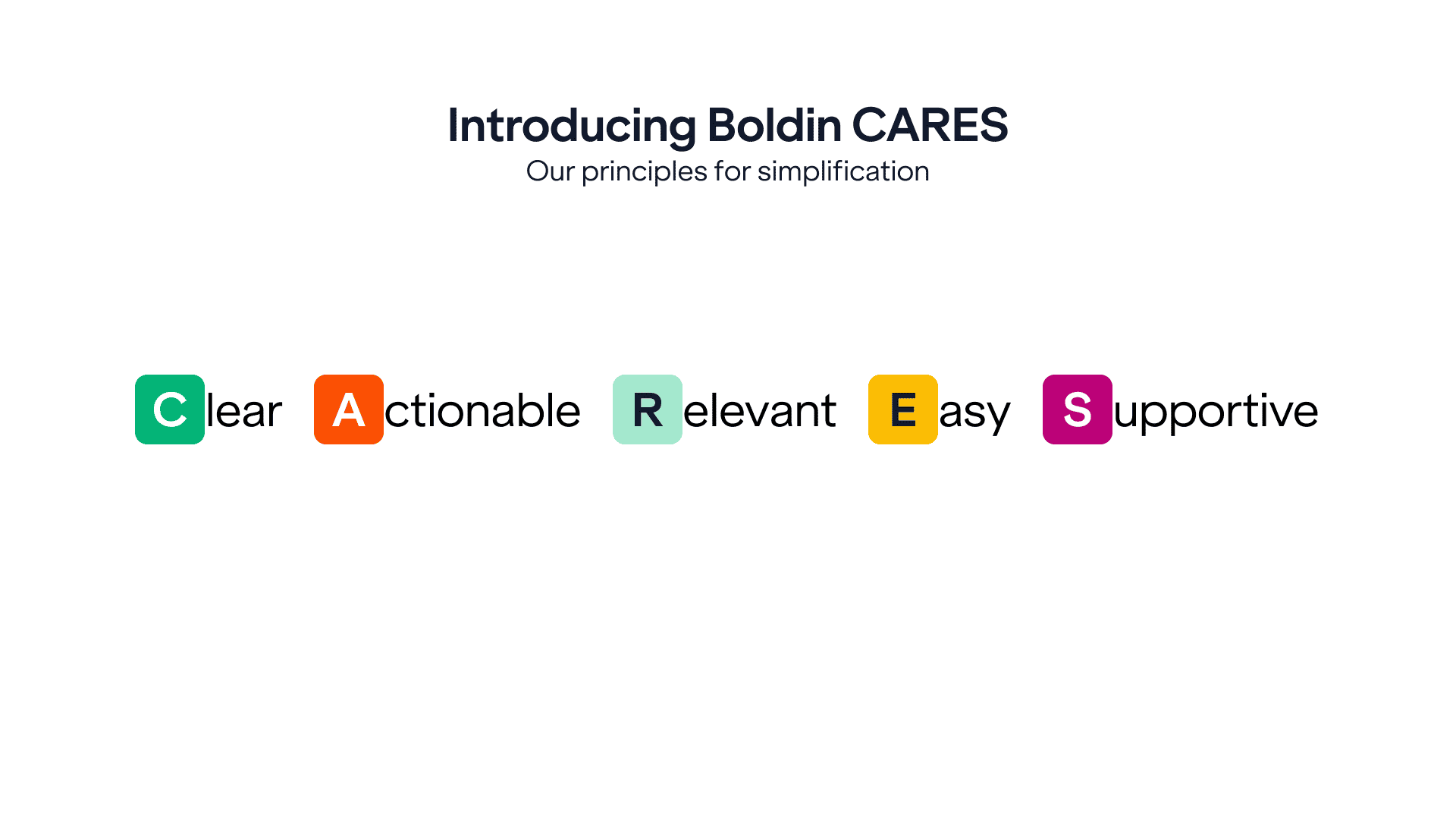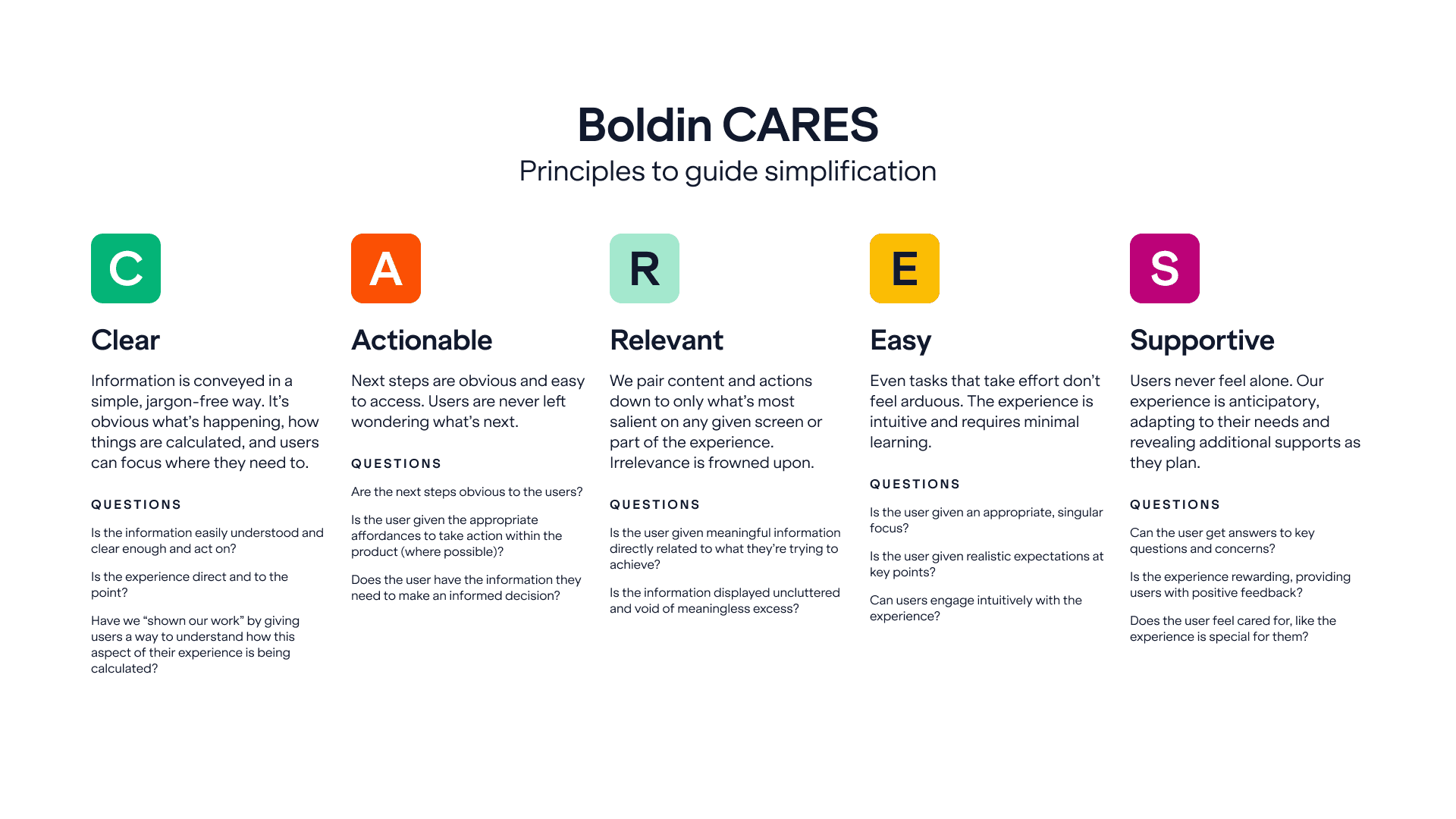 I wanted it to feel like fuel for better thinking, not a top-down mandate. I created the Boldin CARES principles to complement the simplification effort—so teams could make cleaner tradeoffs and improve the product with more consistency over time.