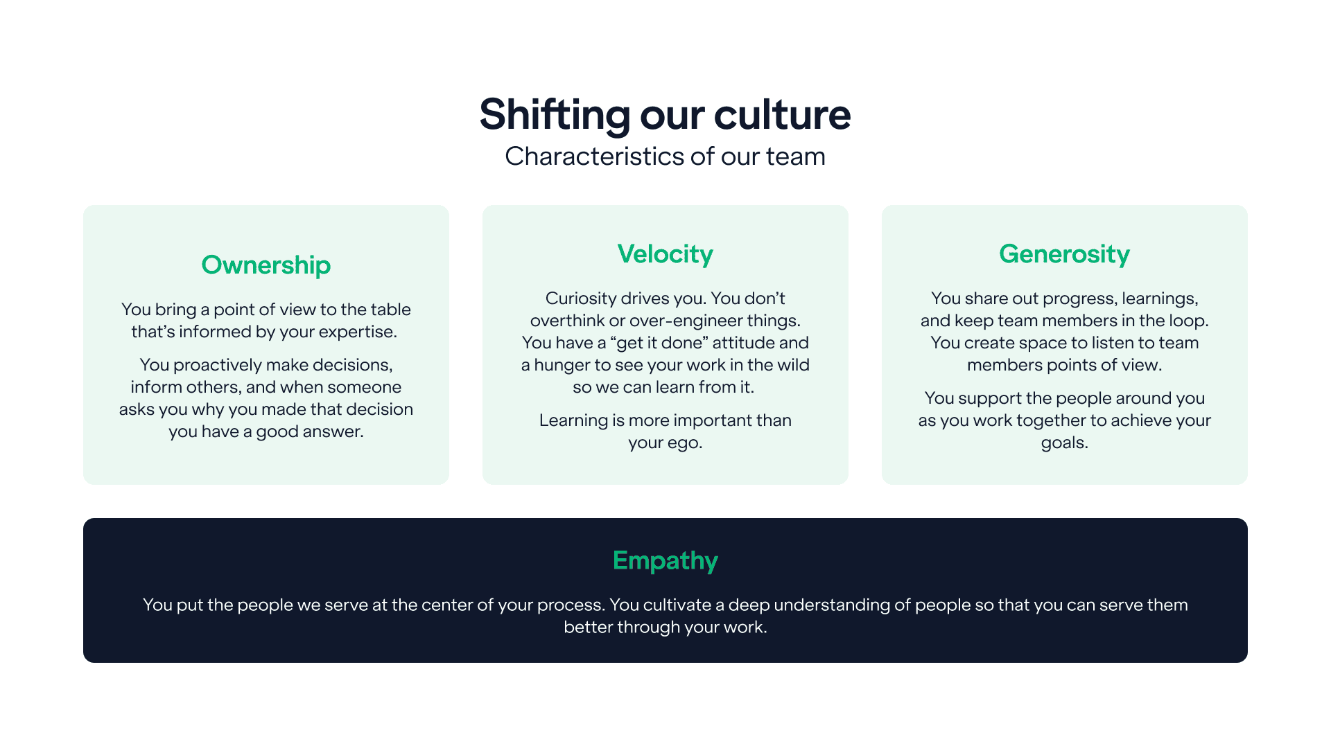 To make the shift concrete, we introduced four team characteristics to guide how we think, work, and show up.