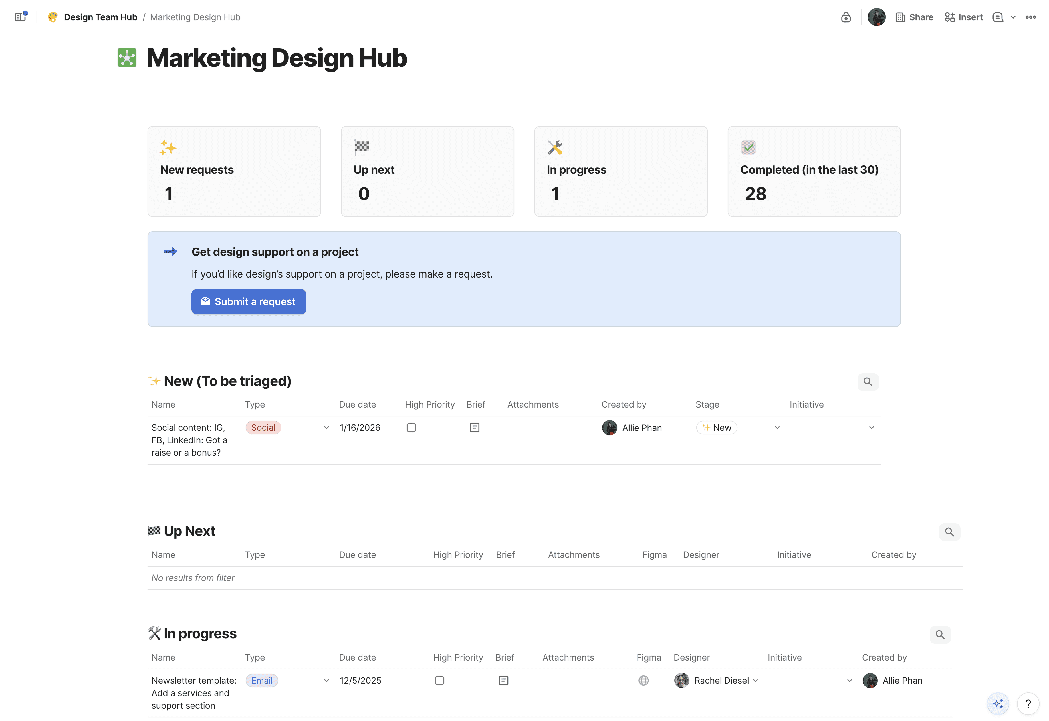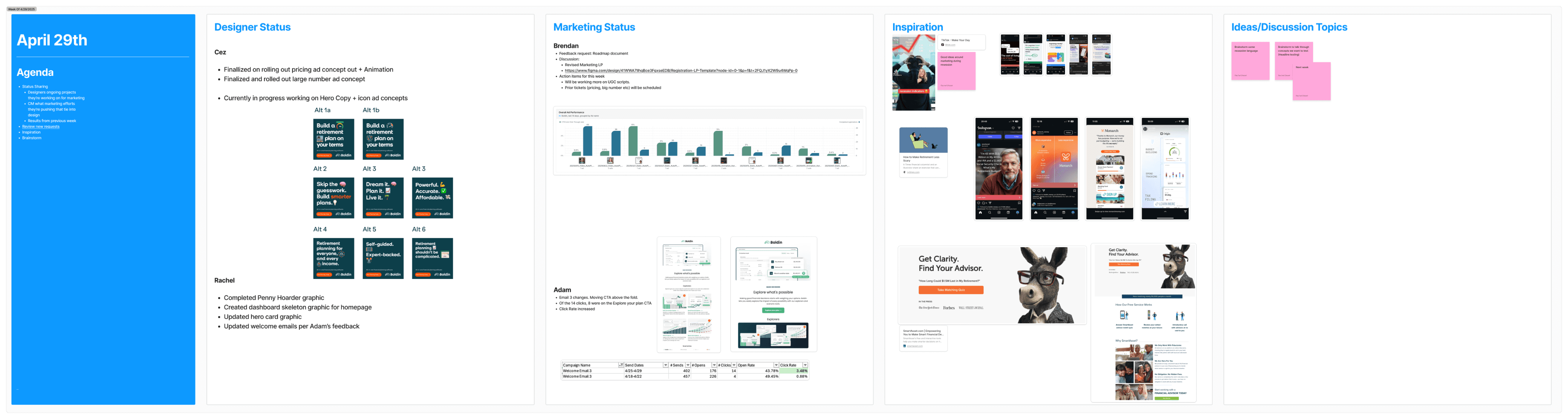 Our weekly sync was specifically designed to create a common culture between our two teams. One hour, one a week. The morning of the meeting I sent out a Slack message reminding team members to update their statuses in our FigJam board and submit any requests to our hub.