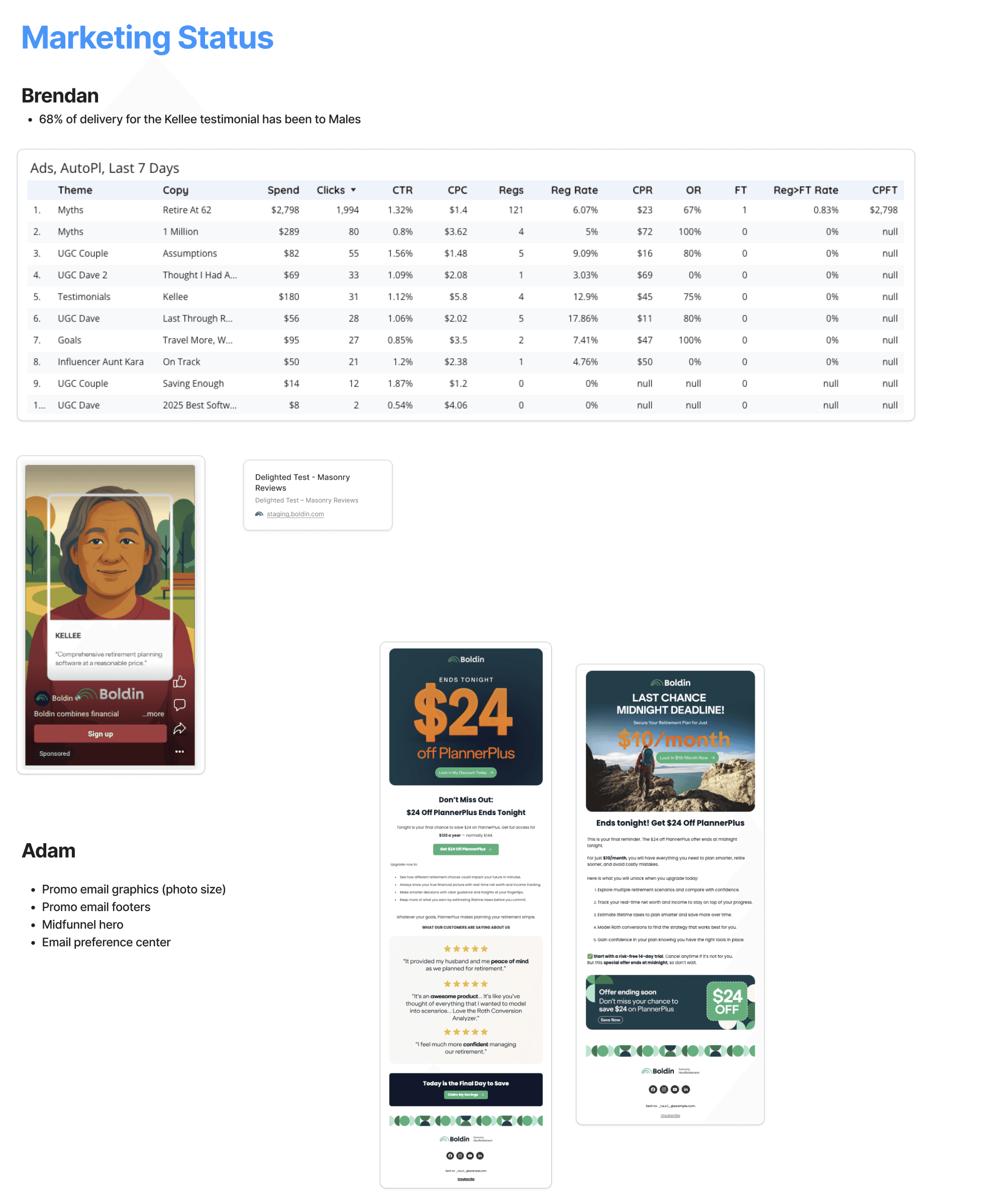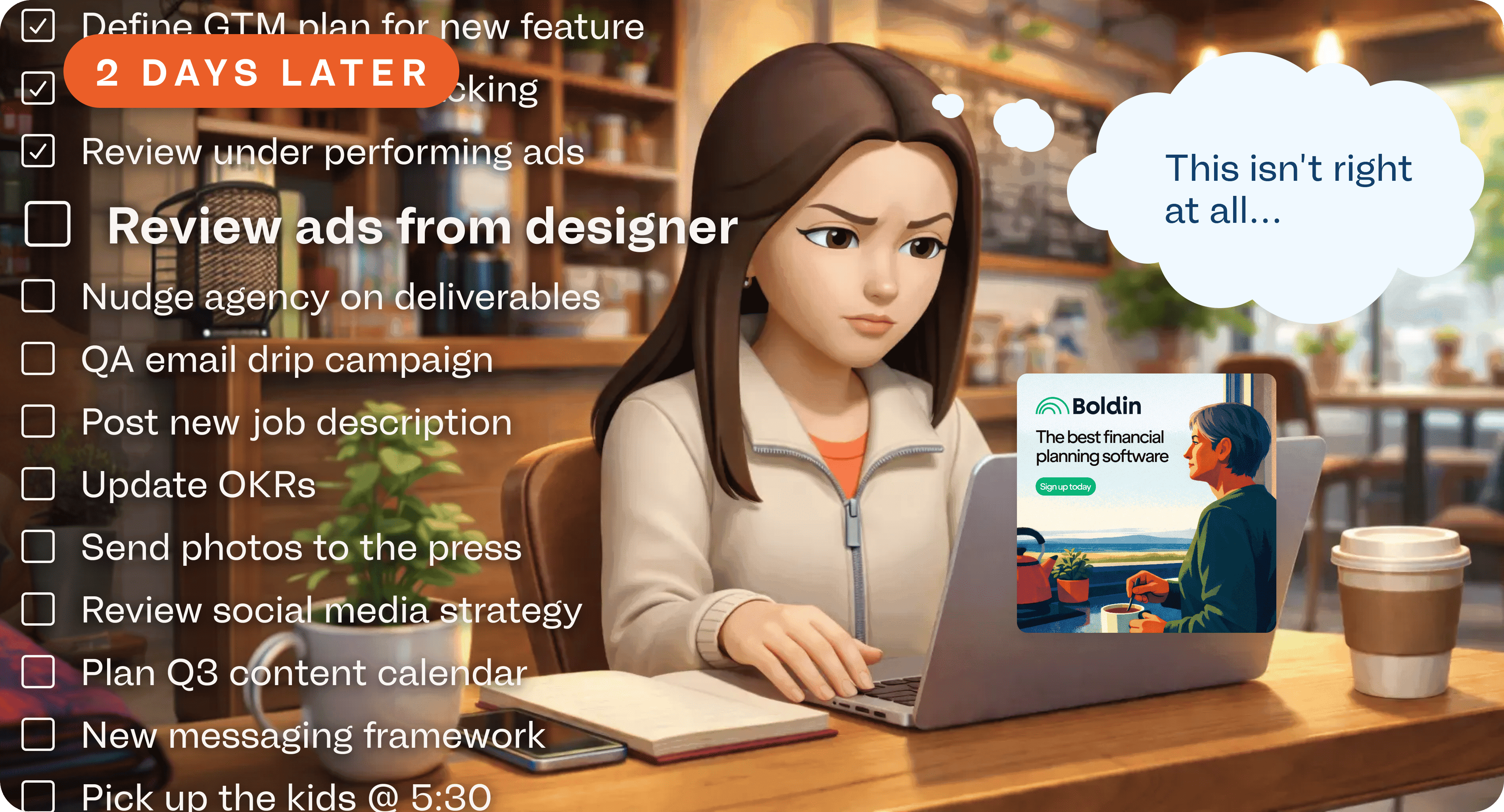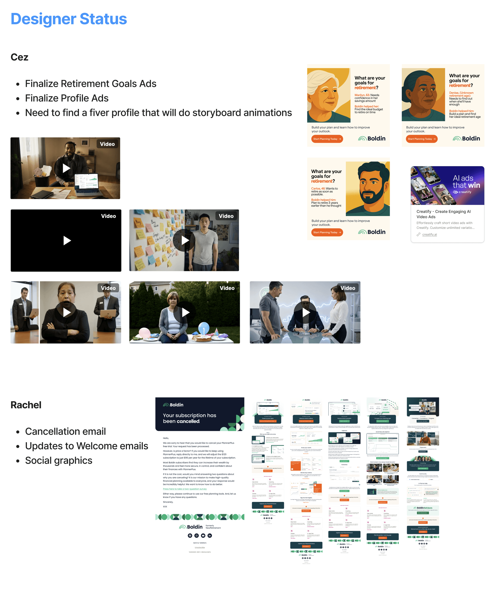 At the beginning of 2025 we had just launched our new brand name, Boldin. The size of the marketing team had doubled, and we were feeling the effects of scaling. As a full service design team, previously if marketing needed design support they would let us know via Slack, we’d execute designs, marketing would be unhappy with those designs, we’d rework them, and eventually marketing would run the assets produced.
